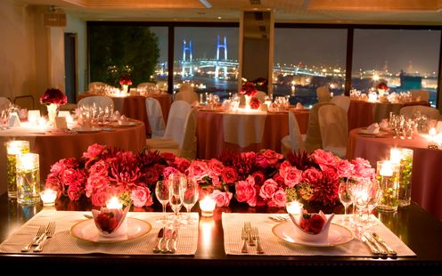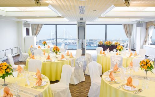 ウッド調で暖色系の造り、豪華客船のダイニングをイメージしたパーティ空間「ラ・メール」。天気に恵まれると横浜港や富士山を一望できるこの会場は、贅沢な気分を味わうことができます。チャペルと同じフロアにあるのでゲストの動線もよく、さらにワンフロア完全貸切のプライベート空間で寛ぎに満ちたひとときを大切なゲストとお過ごしいただけます。また、ナイトタイムには横浜港にイルミネーションが灯り、幻想的な景色を愛でることが可能です。