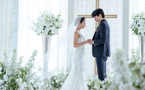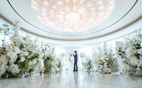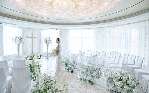 光が柔らかく降り注ぎ、東京のパノラマビューを一望できる純白のチャペル。花嫁憧れの大きなクリスタルシャンデリアがキラキラ光る中で家族との絆を大切にしたセレモニーが叶います。白大理石のバージンロードの先には、ゴールドの十字架も。厳かに響きわたるパイプオルガンやチェロ、バイオリン、ハープの四重奏、聖歌隊の清らかな歌声が神聖な儀式に感動を添えます。挙式から披露宴にまつわるすべてにおいて、楽園のような贅をつくした1日を演出する「ヘブンリーウェディング」を提唱しております。