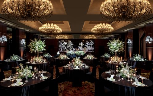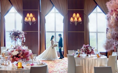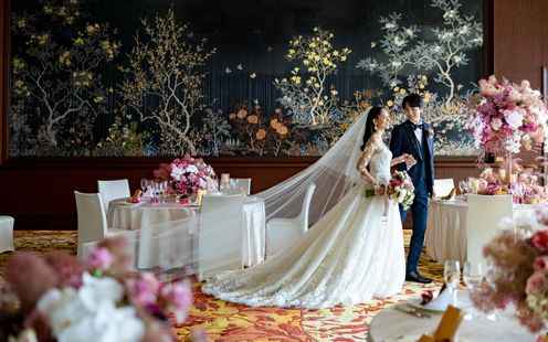 天井高6m、壮麗なシャンデリアとオリエンタルアートの壁画が華やぎを演出する「シャングリ・ラ ボールルーム」は、1日2組に許される贅沢な空間。刻々と移りゆく東京の大パノラマを見渡す開放感溢れる空間で、ゲストと一緒に優雅な一日をお過ごしいただけます。夕暮れ時から始まるナイトパーティは、きらめく夜景がゲストの目を釘付けにすることでしょう。また、ゴージャスなプロジェクションマッピングも叶うので新郎新婦の入場シーンをひときわ華やかに演出いたします。