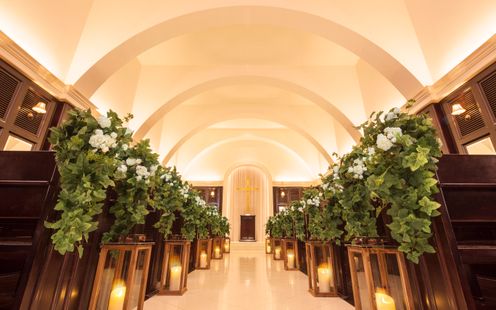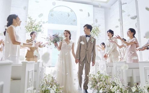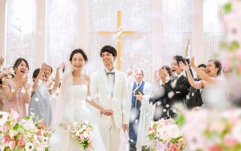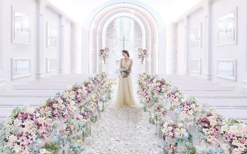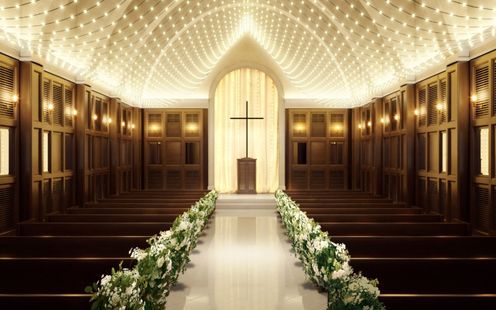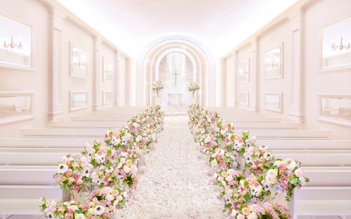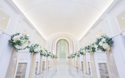 無数のクリスタルとあたたかな自然光がふたりを包み込む真っ白なチャペル。白大理石のバージンロードには花びらを敷き詰めたバージンロードの演出も可能です。透明感あふれるチャペルで家族の絆を大切にした温かなセレモニーが叶います。