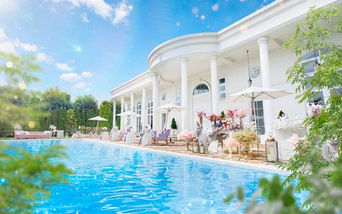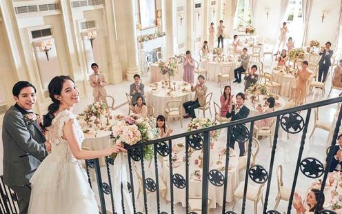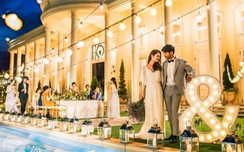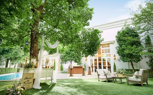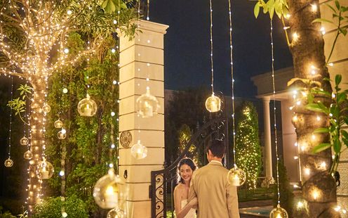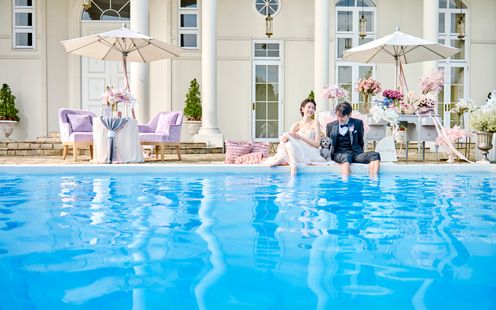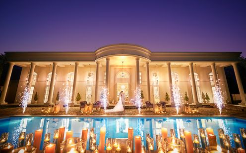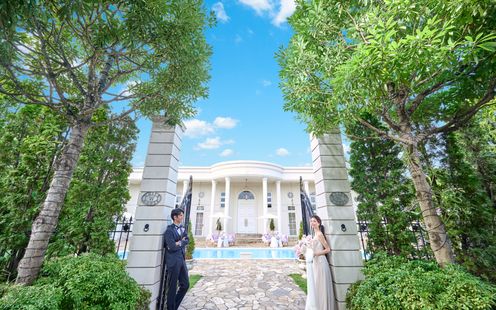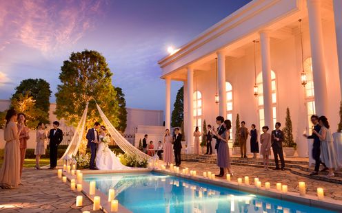 まるでお城のような白亜の一軒家には広大なプール付きガーデンを併設。この贅沢なリゾート感溢れるロケーションをふたりとゲストだけで貸切にできます。青空のもと、みんなでドリンクを片手に祝杯をあげたり、デザートビュッフェを囲んでおしゃべりに興じたり、プールを使ってドロップ&フライで盛り上がったり、ナイトタイムにはキャンドルのきらめきがプールサイドを縁取るロマンチックな時間を過ごしたり、とふたりらしい演出でのおもてなしが叶います。花嫁が佇むだけでも写真映えする空間で楽しいアニバーサリーを過ごして。