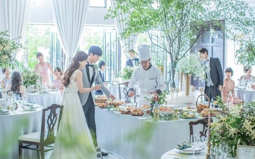 プール付きガーデンに繋がる開放感あふれる空間。パーティ後半は青空のもとで動きのある演出を
