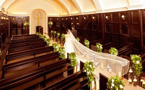 重厚な木目と大理石が厳かな印象を与える「ヴィクトリアハウス」のプライベートチャペル。ライトダウンしてキャンドルを灯せば、思わず溜息がもれる幻想的な空間に。ゲストとの距離が近い、あたたかな挙式が希望のふたりにオススメです。