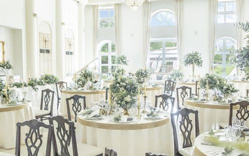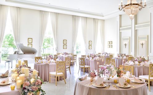 天井高約5mにおよぶ開放的で洗練された大人のパーティ会場。白とブラウンを基調とした上質空間はコーディネート次第でラグジュアリーにもナチュラルにも七変化!ふたりのテーマに合わせた雰囲気を演出いたします。窓を開け放って、ガーデンと自由に行き来する寛ぎに満ちた1日が叶います。
