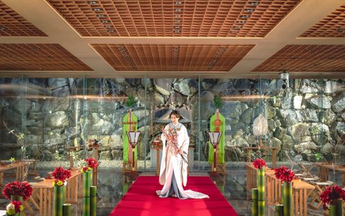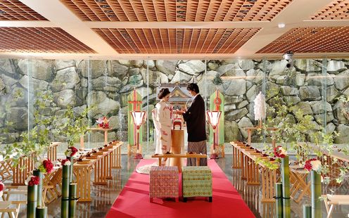 明るい未来を彷彿とさせる陽光の差し込む「九頭竜殿」には、神が出会った奇跡の大木におふたりの未来を重ね、誓い合う神秘の瞬間は列席者を魅了します。大野の神岩に見守られ、九頭竜川の流音がやさしく奏でられ、おふたりを未来へと導きます。