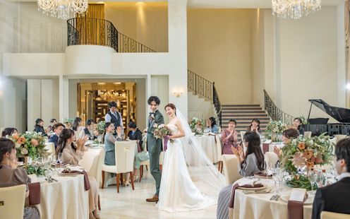 大人な雰囲気がただよう、花嫁の可憐な美しさを引きたててくれる気品あふれる「カーサ・ディ・オードリー」。天井に煌めくシャンデリア、優雅さと温かみを感じさせる会場内には、自然の光がふりそそぎナチュラルな雰囲気やエレガントな大人のイメージも演出可能です。憧れの階段入場もロマンチックにきまります。