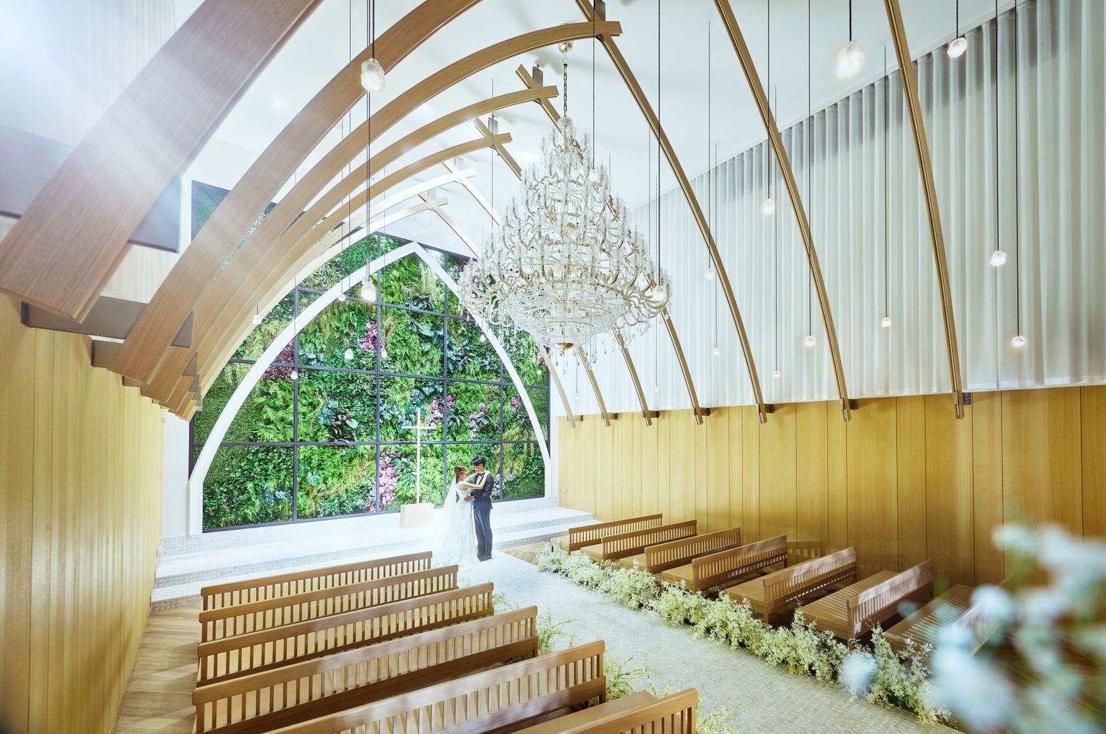 02.<チャペル>アーチ型天井に華麗なシャンデリアが煌めき、緑&光の中で花嫁が美しく映える