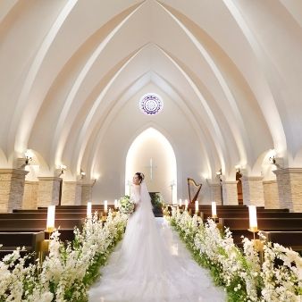 本番と同様の流れで モデルが入り挙式を行うイベントです。入場、賛美歌斉唱、指輪交換、誓いのキス、退場まで行うことが一般的で、所要時間は30分程度が多いです。ゲスト目線を体験できるのがメリットで、自分達の挙式のイメージを描くことができます。