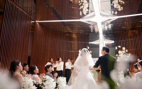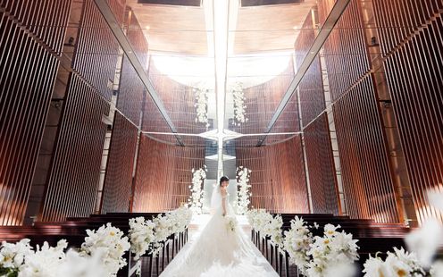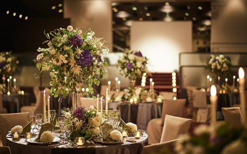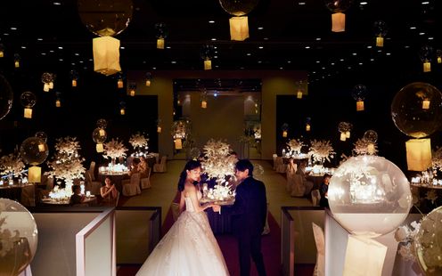 8つものスワロフスキーのシャンデリアが放つ無数の光が会場全体を煌めかせる美しい空間は、花嫁の憧れに満ちた特別な場所。