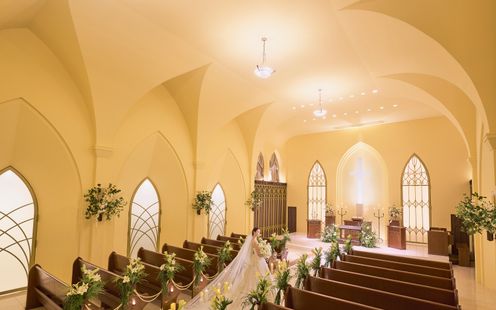 アーチを描いた7mの天井高が優しく包み込み、聖歌隊の生演奏を美しく響き渡らせる。入場時には自然光がふたりを照らし、鳥肌が立つような神秘的な空間を演出。13mもの大理石のバージンロードには花嫁姿が映り込み、挙式本来の意味を大切にした本物の結婚式がはじまる