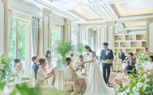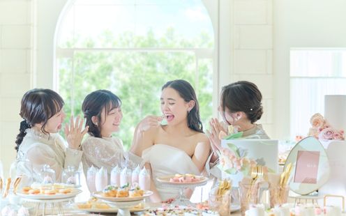 木の温かみを感じる、寛ぎに満ちた空間。会場の壁を使った最新の映像演出や、会場に隣接するプライベートガーデンでふたりらしい自然体の演出をお愉しみいただけます。色鮮やかなスイーツのデザートビュッフェを楽しんだり、歓談したり、思い思いの時間を過ごしながら、ここに集う全てのゲストが幸せに包まれるひとときをお過ごしいただけます。