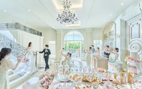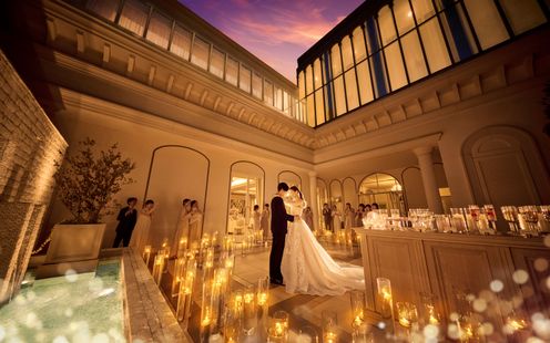 天井高11m、ロイヤルブルーのバージンロードは長さ22m。英国から受け継いだアンティークの美しいステンドグラスやパイプオルガンがふたりの誓いの瞬間を見守る人気の大聖堂。天井はゆるやかにアーチを描き、まるでヨーロッパに息づく教会を彷彿させます。この聖なる空間ではかけがえのない「家族の絆」を大切にした、オリジナルセレモニーが叶います。挙式後は、青空を望む全天候型アトリウムでゲストの歓声と喝采に包まれながらのフラワーシャワーをお愉しみいただけます。