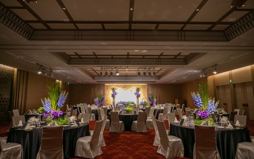 天井高5.2mの開放感と、無数のクリスタル輝くリングの連なったデザインのモダンなシャンデリアが印象的。オーチャードの由来にもなっている「果樹園」をモチーフにしたアートウォールがふたりとゲストの「実り多き人生」を祝福し、宴席に華やぎを与えます。多彩な照明演出含め、自由なレイアウトが叶うのも魅力。会場専用ホワイエも完備し、大人数のパーティでも約束された圧倒的なプライベート感も人気の会場です。なお、このほか900名まで着席可能な同ホテル最大の空間「平安の間」もご用意しております。