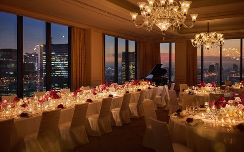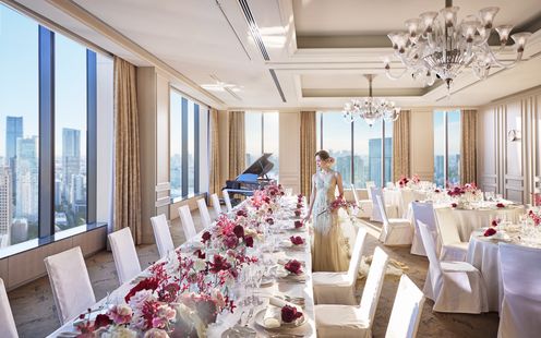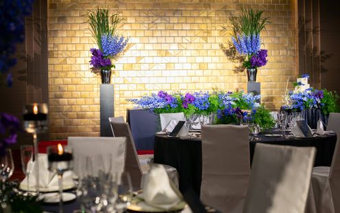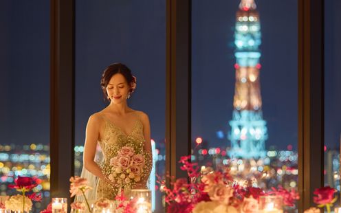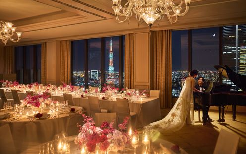 〈スカイチャペル〉と同じ、ホテルトップフロアである41階に位置するバンケット。2面の大きな窓からは六本木~赤坂方面、また東京ベイエリアの眺望を一望できます。東京タワーを背景にウエディングケーキ入刀ができるのも魅力。優美な曲線を描くシャンデリアが上品でクラシカルな雰囲気を演出し、開放感溢れるパーティーが叶います。