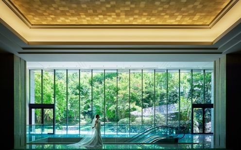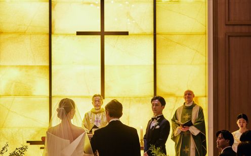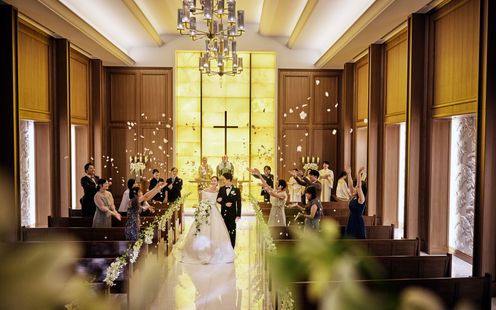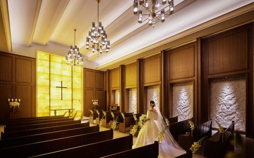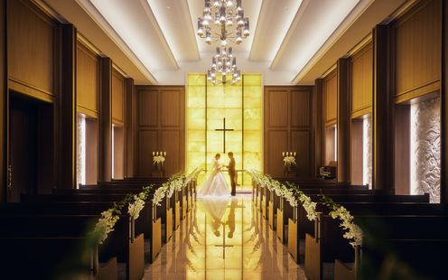 プレステージタワーの7階に位置する「グランドチャペル」は、ヨーロッパの雰囲気漂う厳かな佇まい。高い天井に配された大きなガラスのペンダントライトとウッディなインテリア、イエローオニキスが融合し、ふたりの大切なセレモニーを引き立ててくれます。The Okura Tokyoでは、これまでにない体験したことのない特別な新しいセレモニーを実現します。