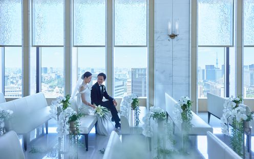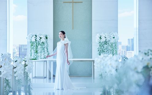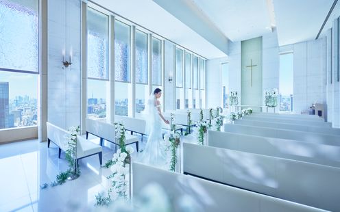 都心の大パノラマがふたりの誓いの瞬間を彩る「スカイチャペル」は、光に満ちた真っ白な教会。天空に近いチャペルで絆感じるアットホームなセレモニーを。