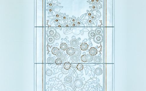 和のスタイルが映えるオークラらしい会場。縁起の良いゴールドタイルと、創業時より会場にあしらわれていた鱗(うろこ)文様の陶板アートが祝宴の席に華やぎを与えます。また、日本の建築技法により、縁起物のモチーフが随所にあしらわれているのが特徴的。床には菖蒲のカーペット、天井には縁起の良い松葉の組子格子をあしらった光欄間が気品ある空間を演出いたします。