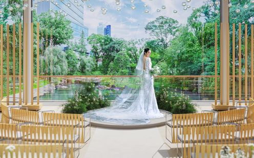 庭園を望み陽光差し込む背景がおふたりを寄り華やかに祝福する