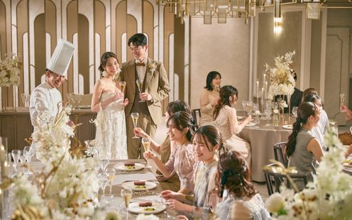 形式ばらず、肩肘はらず、かといってカジュアル過ぎない。今までふたりのことを見守ってくれたゲストと寛ぎに満ちたパーティを考えているふたりにおすすめしたい【クラージュ】。モダンな空間ではゲスト一人ひとりとのふれあいを大切にした心温まるパーティが叶います。