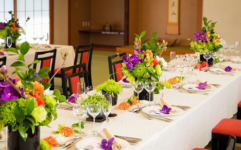 柔らかく陽射しを通す障子をあけると、美しい石庭がゲストの心を癒す和の空間。いぐさの香り漂う畳敷きのお部屋は、何故かホッと心穏やかにお過ごしいただける、あたたかな空間です。華やかな和装から純白のウエディングドレス、色鮮やかなカラードレスでのご登場まで、和洋どちらのスタイルのパーティもおススメです。会場に併設された石庭や、その先に広がるロケーションを眺めつつ、風や陽の光を感じながらの祝福と口福のひとときは、ゲストの記憶にいつまでも残る特別な時間となるでしょう。石庭に、番傘や縁台配置しての写真撮影や、ゲストにも石庭での時間をお楽しみいただくデザートブッフェの演出なども大人気です。「和」のしつらえが楽しめる会場だからこそ…他のパーティ会場とは少し違ったスタイルのウエディングが実現します。