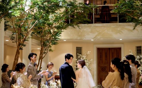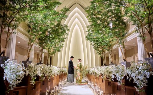 3層吹き抜けの高い天井は高さ12m、バージンロードの長さ25m。2024年、鴨川沿いの自然を感じる独立型大聖堂が誕生。天井高12mの壮大なスケール感をそのままにして、バージンロードには京都の「参道」をイメージした石畳を取り入れ、京都らしさ薫る上質な空間へと生まれ変わります。