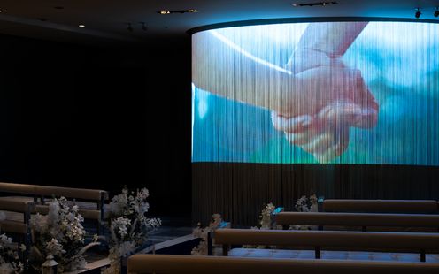 照明にも折り紙を思わせる和モダンなデザインを取り入れています。また、ご親族だけでなくご友人など親しい方々にもご参列いただける配列となっております。