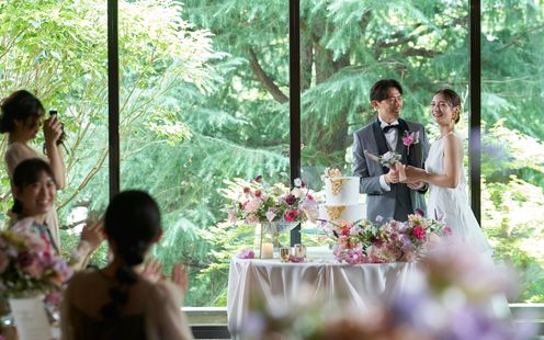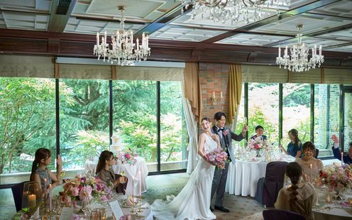 二面の大きな窓を有しており緑が映り込む窓際でのパーティ演出は、まさに絵になるような雰囲気です。またロマンチックな雰囲気のトワイライトウエディングも。