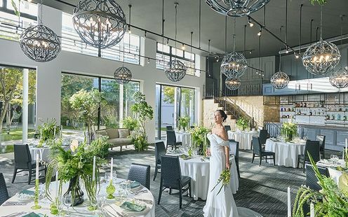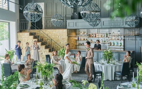 まばゆい緑のガーデンに隣接する開放感あふれるパーティ会場。小宇宙を思わせる印象的な照明が印象的で、憧れの階段入場やガーデンからのサプライズ入場も叶います。昼は自然光に包まれてデザートビュッフェを囲んで歓談したり、夜はキャンドルが煌めく中でランタン演出を楽しんだり、などガーデンの使い方もふたり次第!