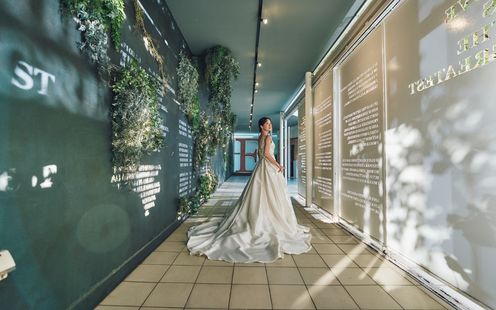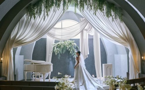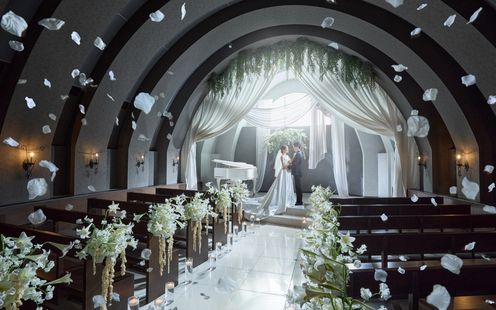 チャペルへ続く回廊は光が踊る通路。誓いの場所へ行くために光のシャワーを浴びて歩みを進めて。扉から一歩足を踏み入れると、洞窟を思わせるアーチ型の天井から優しい光が注ぎ込むチャペルがお目見え。ゲストと距離の近い心温まるセレモニーが叶います。家族の一員である愛犬も参列可能ですのでリングドッグ演出などお楽しみいただけます。