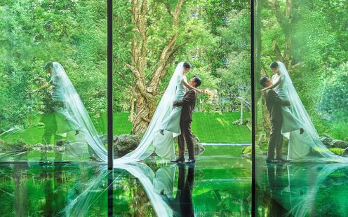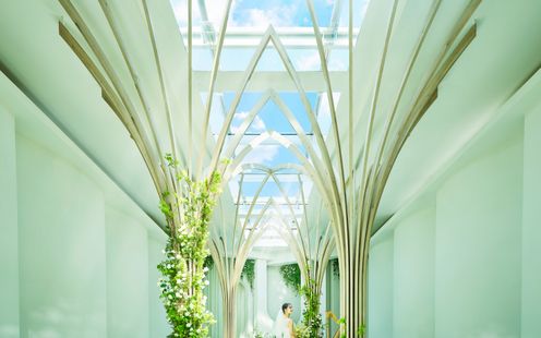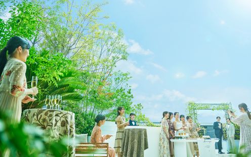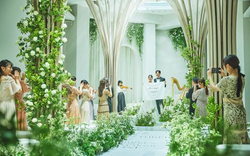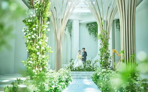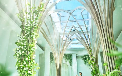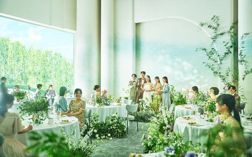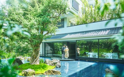 水盤に映るおふたりの姿が、まるで絵画のように美しく残る幻想的な空間。ガラス張りの回廊や、陽光が差し込む水辺のテラスが、唯一無二のアートのような瞬間を演出します。街の喧騒とは一線を画す、誰もが心地よく過ごせるこの場所で「人生を彩るアートのような結婚式」を。