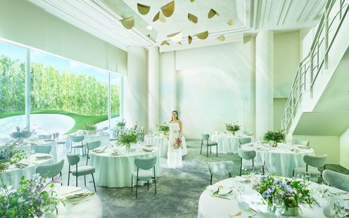 天井高6mの広々とした空間に、大きな窓から自然光がたっぷりと差し込む開放的な披露宴会場。白を基調としたデザインは、おふたりの個性を自由に表現できるキャンバス。大階段からの華やかな入場は、映画のワンシーンのような感動を演出。さらに、隣接するテラスも貸切可能で、開放的なガーデンパーティも実現。大切なゲストと特別なひとときを心ゆくまで楽しめるパーティ会場です。