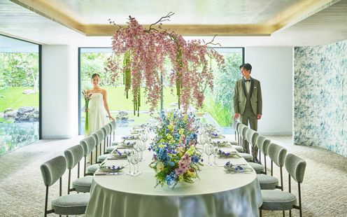 ワンフロアすべてが貸切の少人数専用バンケット。まるでスイートルームのような贅沢なひとときを。広々としたウェルカムスペースを完備し、ゲストとゆったり過ごせる特別な空間です。窓の外には水盤と緑が広がり、季節ごとに異なる表情を見せるアートのような景色が楽しめます。まるで邸宅に招かれたような雰囲気の中、美食を囲みながら過ごす祝宴。開放感とプライベート感が調和する空間で、心に残る特別な時間をお楽しみください.