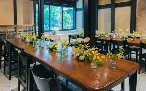 披露宴を行うダイニングは奥にも庭があり、大きな窓から緑を臨みながら落ち着きある空間。