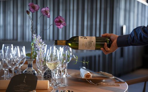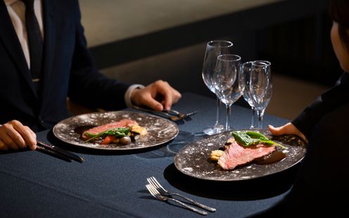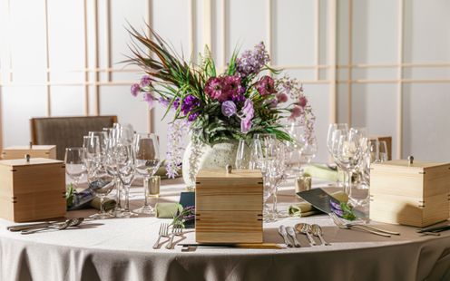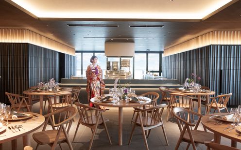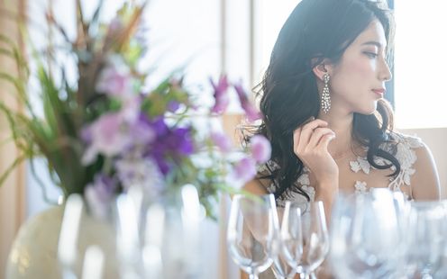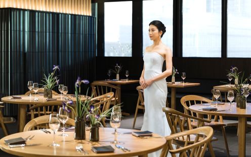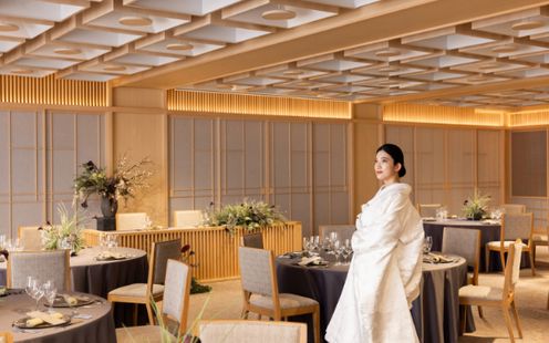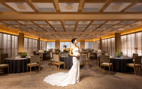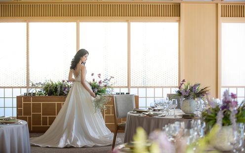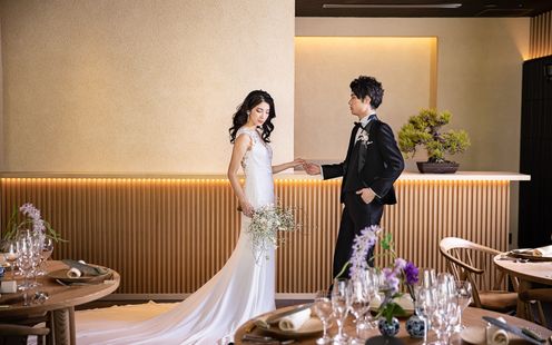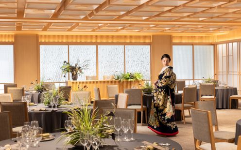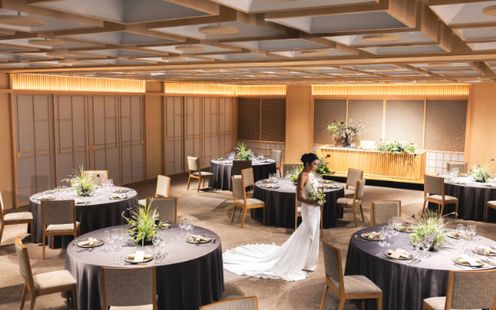 福岡の伝統工芸“大川組子”が随所に施されている上品な披露宴会場。専用のオープンキッチンを備え、出来立てのお料理でゲストをおもてなし。和モダンな空間は1フロアごと貸切にできる為、おふたりと大切なゲストだけのプライベートウェディングが叶います。
