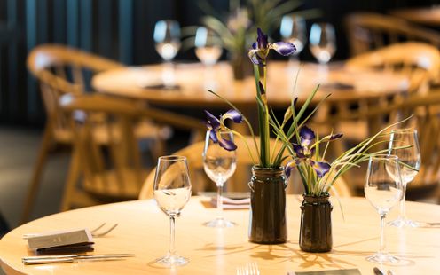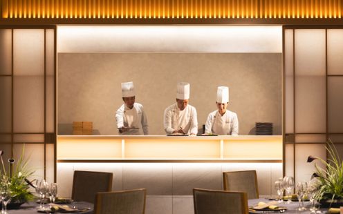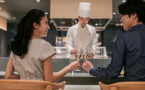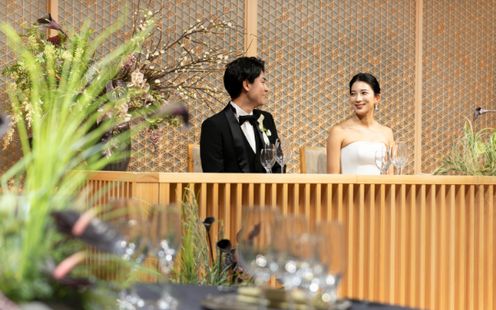 ライブ感あふれるオープンキッチンから届く出来立てのお料理。シェフの繊細な手捌きや、調理する音・広がる香りが五感を刺激し、披露宴への期待が高まる特別な空間が広がります。 瓦素材の壁や大理石のキッチンが与える重厚感と、木の温もりが調和したシックな会場です。