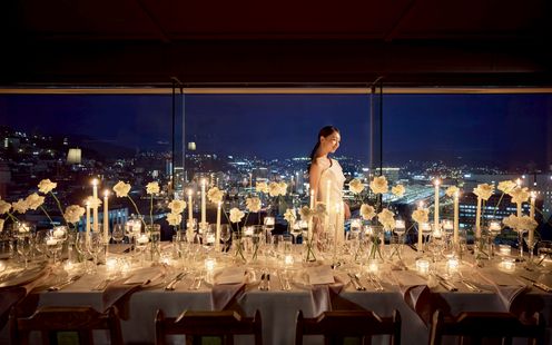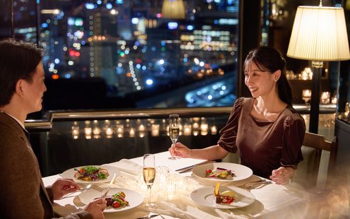 ホテル15Fからの絶景を望むダイニングレストランで、会話を楽しむふたりらしいパーティを