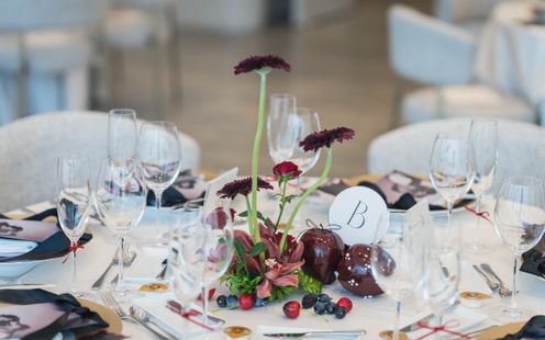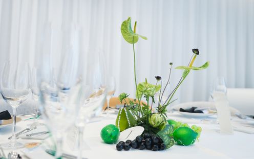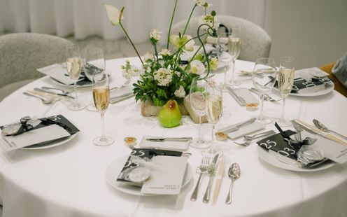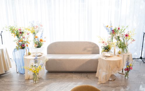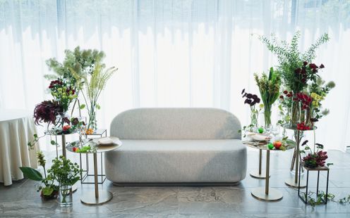 会場いっぱいに広がるシャンパンをモチーフにしたオブジェ。一片一片、パール加工が施され、風に揺れる煌びやかなその画は写真映えも抜群。大理石のオープンキッチンやデザイナーズチェアなど、ゲストがワッと驚く仕掛けや自然体でラフに過ごせる工夫が詰め込まれている。