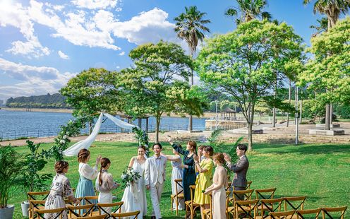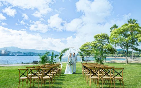 海を望む広大な芝生が挙式の舞台。海外ウェディングのような空間は写真映えも抜群!