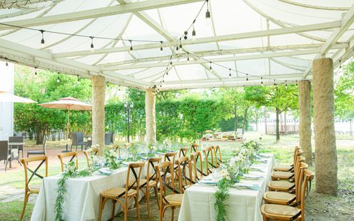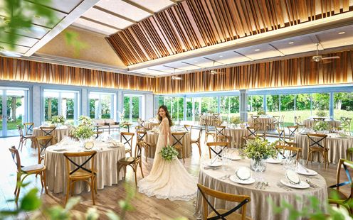 木のぬくもりを感じるシンプル&ナチュラルなデザインが心地よい会場です。ガーデンと一体になったような開放感が魅力で、光・風・緑がふたりのパーティを祝福します。ソファ席を取り入れたカジュアルスタイルや、ガーデンからのサプライズ入場、ウェルカムパーティなど、自由でアットホームな時間を楽しんで。