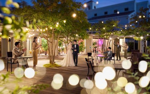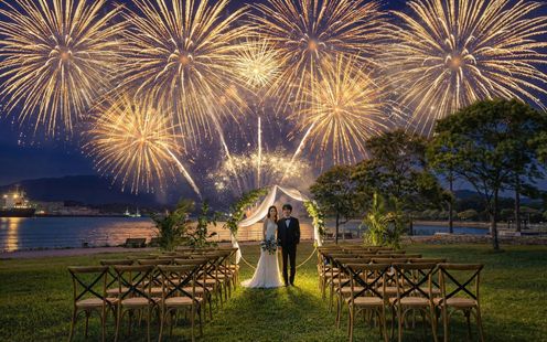 海に面した芝生のガーデンチャペルでは、プライベート感あふれる海外ウェディングのような誓いを。パーティ会場とも隣接しているガーデンでは、プールサイドを利用してウェルカムパーティやアフターパーティを楽しめます。午後のパーティなら花火演出も可能!6~9月はBBQ二次会もおすすめです。