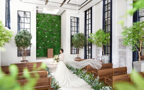 モダン空間に緑が柔らかく溶け込み、温かみを感じさせるチャペル。ドレスが美しく映える舞台