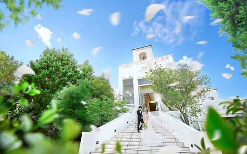 美しいグリーンウォールが印象的なチャペルは、天井高7mの開放感と、10mを超えるバージンロードが魅力。白と木目を基調にしたモダンな空間は、花嫁のドレスが光をまとったように映え、歩くたびにシルエットの美しさが際立ちます。直線的で無駄のないインテリアが、誓いの瞬間をよりドラマチックに演出。教会式はもちろん、人前式も可能で、挙式後は大階段でフラワーシャワーを楽しんで。