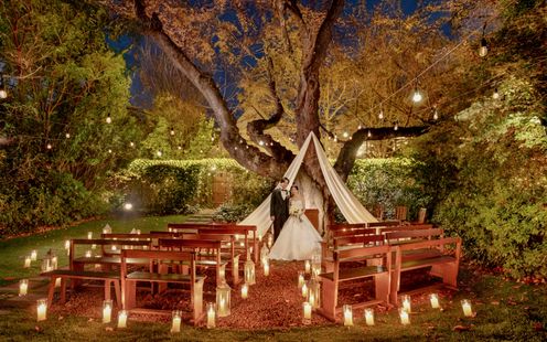 柔らかなライトに照らされる木々、揺れるキャンドルの炎、夕暮れで交わす誓いの言葉は、まるで映画のワンシーンのようなドラマチックな時間を紡ぎます。キャンドルに照らされながら舞い上がるバブルシャワーは、昼間とはひと味違う幻想的な美しさを演出。ライトアップされた空間で、ゲストと語らい、笑い合いながら、特別なひとときをお楽しみいただけます。