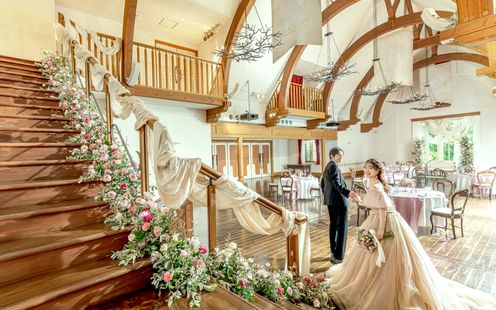 「森の音楽堂」をイメージしたチャペルは、天井高18mの開放感と、木の香りに満ちた温もりが広がります。チャペルでは珍しい円柱状の空間は、音が柔らかく反響する特別な設計に。ハープやチェンバロの生演奏や神父の言葉、そしてゲストの拍手が、まるで森の中で奏でられる音楽のようにふたりを優しく包み込みます。奏でる曲の希望があれば相談を。楽譜がある曲であれば対応可能ですので、おふたりの思い出の曲でのセレモニーが実現します。挙式後は、チャペル前のガーデンで色とりどりのフラワーシャワーやぬいぐるみトスも。幻想的なナイトウェディングも評判です。