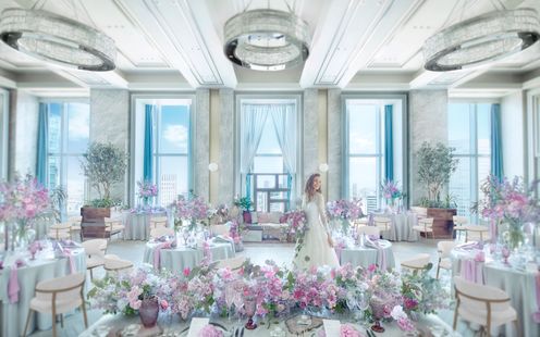 専用エレベーターで最上階の28階へ。クローク・更衣室・待合室などの設備もあり、ワンフロア全てがふたりのウェディングステージ。バリアフリー設計なので年配ゲストへの配慮も行き届きます。さらに全天候型施設なので、天気や寒暖差に左右されずに当日を迎えられるのも安心。専用インナーガーデン付きの広々した空間でウエルカムパーティを行うなど使い方はふたりの思いのまま。大きな窓から陽光がたっぷり入る明るい会場なので合わせるカラーによってラグジュアリーやカジュアルなど、様々に雰囲気に一変。シェフズテーブル演出で料理を楽しむパーティでのおもてなしも叶います。