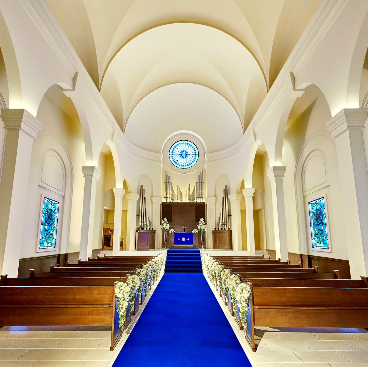 02.”永遠に続く”という意味を持つロイヤルブルーのバージンロードが印象深い荘厳なチャペル