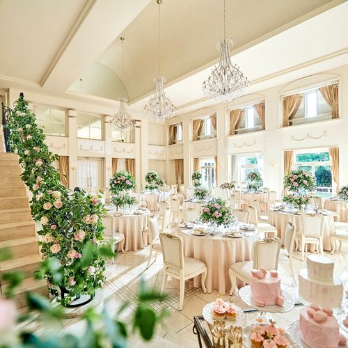 私たちが選んだ「シェルダジュール」は、白を基調とした本当に可愛い会場です。なんといっても大階段があり、初めて見たときから、お姫様のような素敵な会場にワクワクしました。高砂の後ろはカーテンを開けるとガーデンがあり、そちらから入場することもできます。