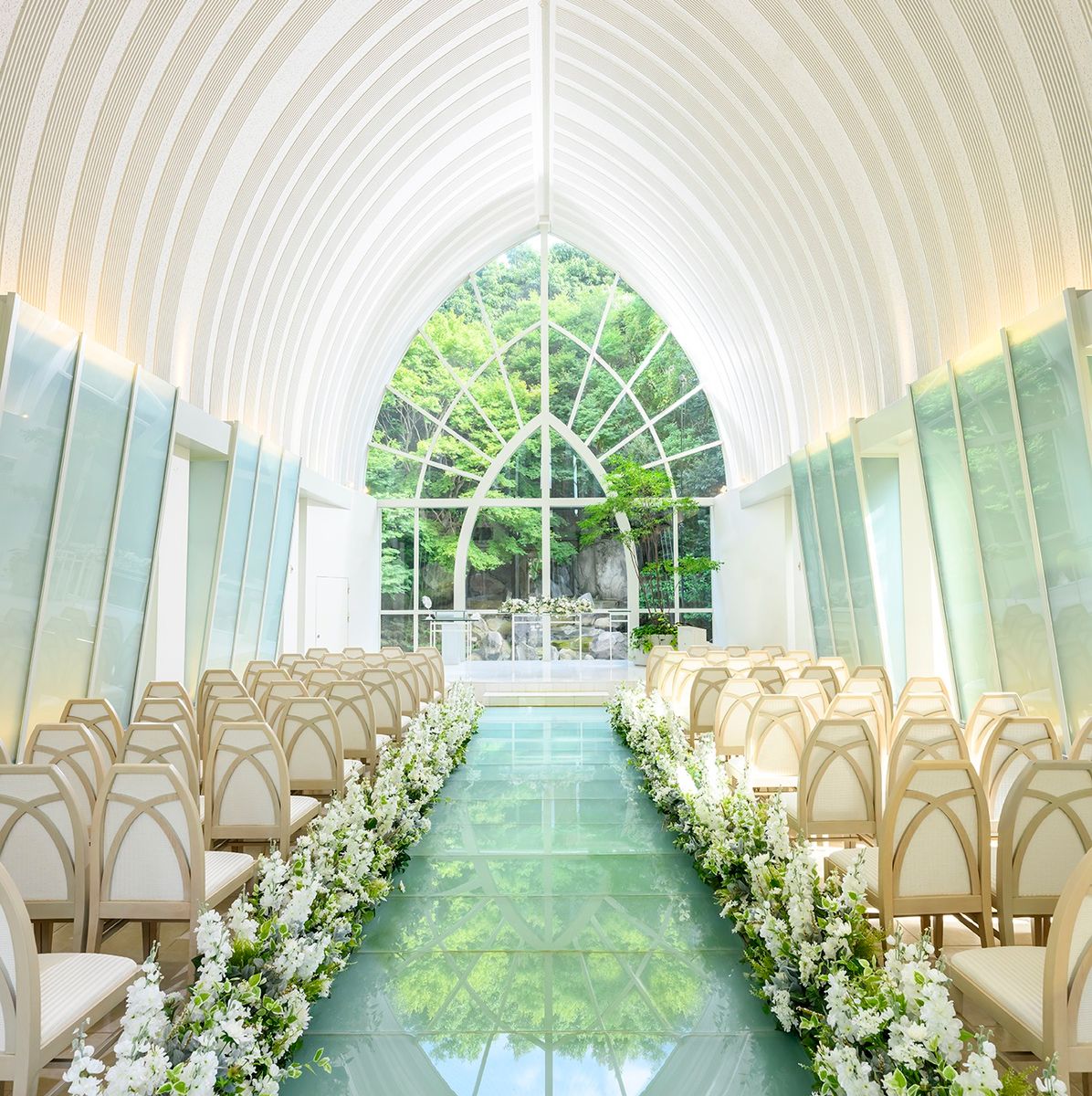 02.<独立チャペル>象徴的な滝が流れる光と緑に包まれた会場。挙式後はガーデンでの演出も