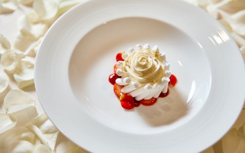 これまでにも多くのゲストをもてなしてきた経験豊かなシェフが細部にまで気を配り、至福の料理を創り上げます。専用キッチンから運ばれるシェフこだわりの料理は、フレンチにかかわらず、和洋折衷など様々な要望にお応えします。また、思い出の味や好みの食材を取り入れた料理などその日のためのオリジナルメニューや、シェフ特製の2種類のメインディッシュを当日ゲストに選んでもらえるコースなど、ふたりの希望にあわせて提案いたします。
