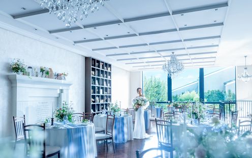自然光が降り注ぐ白を基調にした木の温もり感じるナチュラルなパーティスペース。開放感たっぷりの大きな窓からはガーデンの緑が望め、パーティ会場専用のロビーではデザートビュッフェなどのサプライズ演出も可能。動きのあるにぎやかなパーティが叶います。もちろん、オープンエアな空間で演出もお愉しみいただけますので憧れのイメージをプランナーに何でもご相談ください。ワンフロア貸切なので、寛ぎの一日を!
